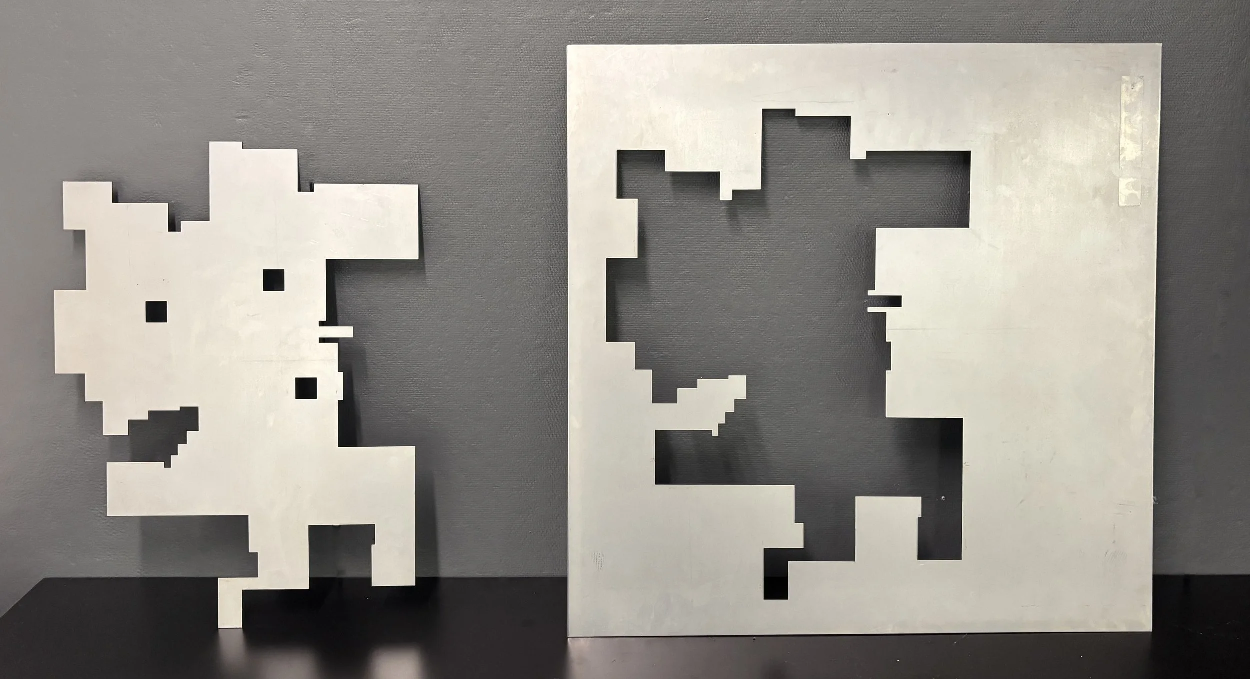 BDC Cutout is a video sculpture exploring the eerie beauty of an abandoned building. A metal cutout of the building’s floor plan is hidden behind its border. A blurred sequence of images from the space are overlayed using projection. The images penetrate the sculpture revealing its depth and placing the viewer inside.